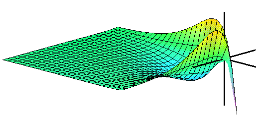 Grafen till funktionen f ( x, y ) = x y e y - x. Funktionen har stationära punkter i ( 0, 0 ) och ( 1, -1 ). |