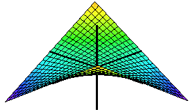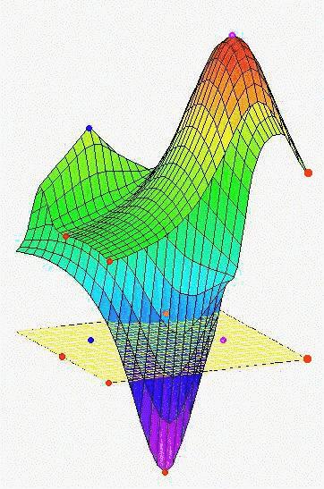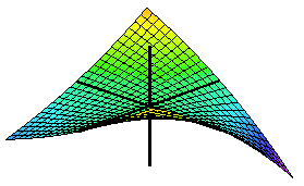 i x, y- planet. Funktionen har fyra extremvärden i punkter på randen till området. Den har två extremvärden i punkter i det inre av området. I den ena (kritisk punkt) är funktionen inte deriverbar, i den andra har funktionen en stationär punkt (kritisk punkt). |