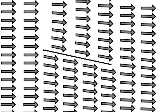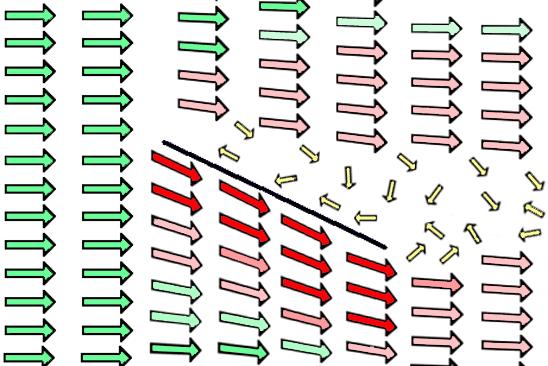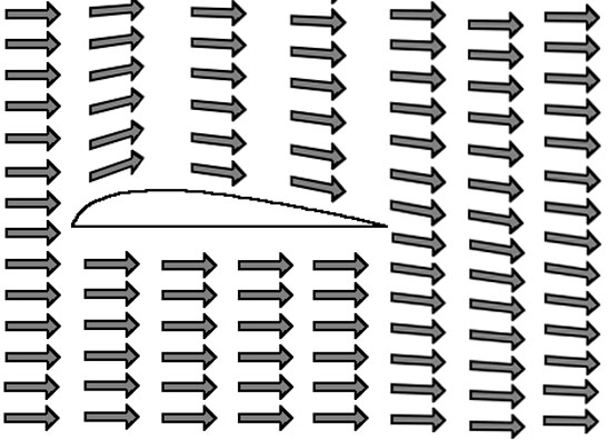 I bild 4 har vi gett den platta vingen anfallsvinkel. Vi ser att samma effekt uppnås som med den rundade profilen. Även den platta vingen ändrar riktning på den passerande luften och skapar lyftkraft. Desto större anfallsvinkel vingen har ju större fart får luften som passerar vingen nedåt, vilket ger mer lyftkraft. Samtidigt som vingen får en större bromsande kraft.