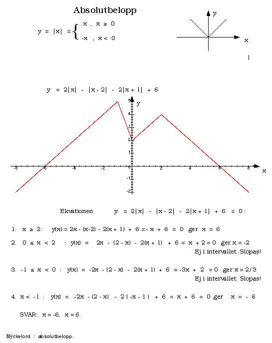 Notera definitionen av absolutbeloppet samt grafens utseende. I ett funktionsuttryck med flera absolutbelopp får grafen hörnpunkter för varje x-värde som utgör ett 0-ställe för ett absolutbelopp. I detta fall: x = -1 , 0 och 2. Vid ekvationslösning där absolutbelopp ingår är det praktiskt att dela in lösningen i olika fall baserade på de intervall i vilka uttrycken innanför absolutbeloppstecknen inte ändrar tecken. På så sätt kan man lösa ekvationen inom varje intervall utan absolutbeloppstecken. Observera att de erhållna rötterna måste ligga i motsvarande intervall. Annars slopas roten. | |
