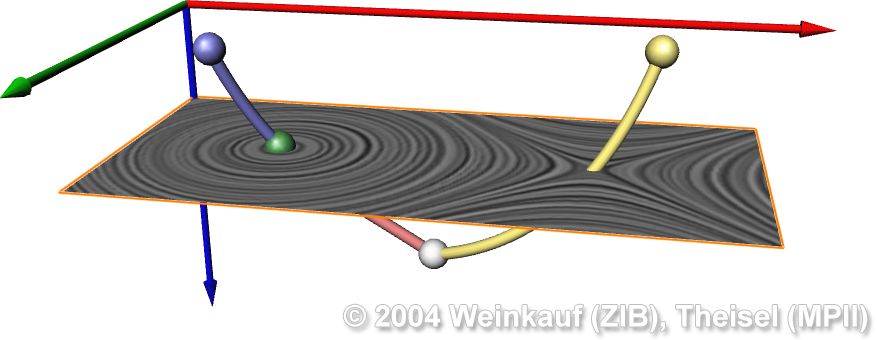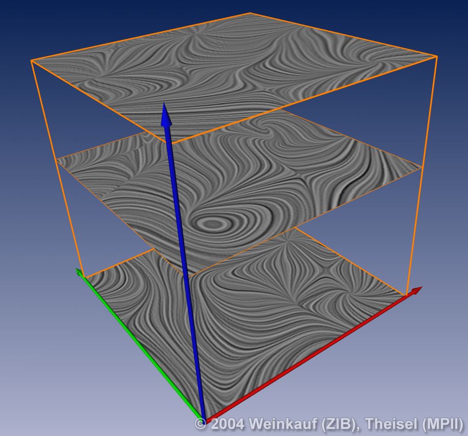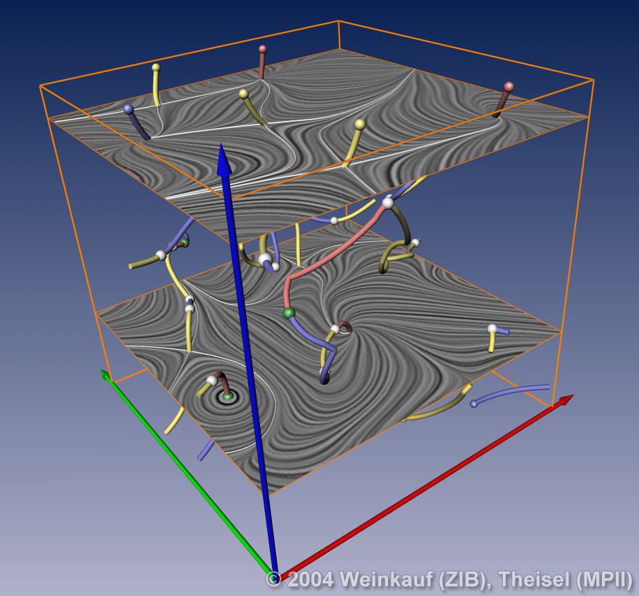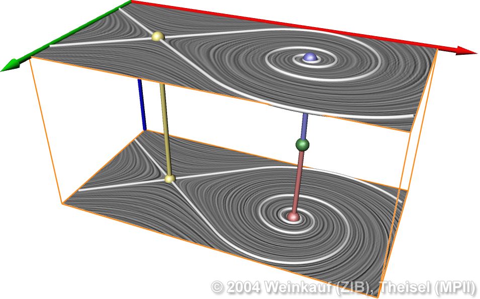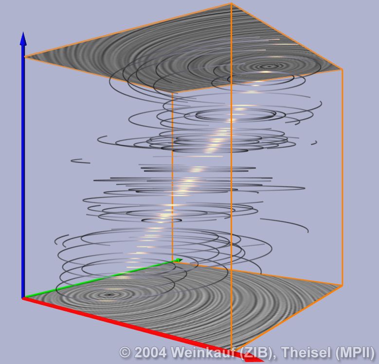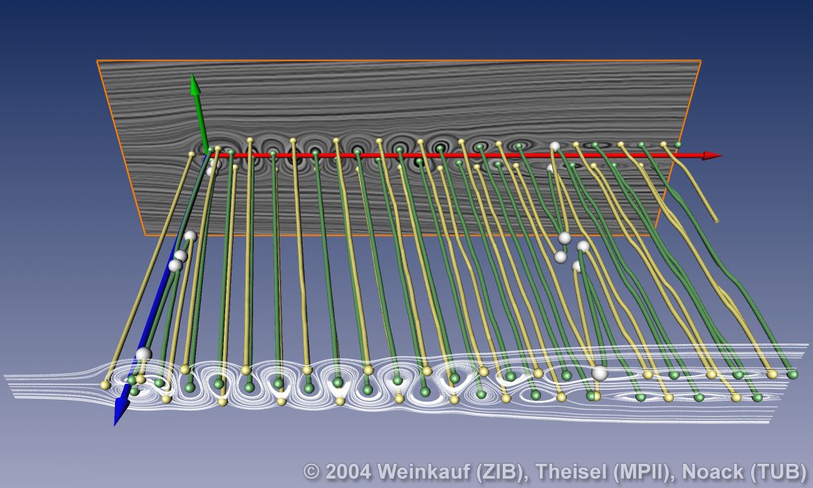 Topological methods aim at the segmentation of a vector field into areas of different flow behavior. For 2D time-dependent vector fields, two such segmentations are possible: either concerning the behavior of stream lines, or of path lines. While stream line oriented topology is well established, we introduce path line oriented topology as a new visualization approach in this paper. As a contribution to stream line oriented topology we introduce new methods to detect global bifurcations like saddle connections and cyclic fold bifurcations. To get the path line oriented topology we segment the vector field into areas of attracting, repelling and saddle-like behavior of the path lines. We compare both kinds of topologies and apply them to a number of data sets. | Stream Line and Path Line Oriented Topology for 2D Time-Dependent Vector Fields Proc. IEEE Visualization 2004, Austin, U.S.A., October 10 - 15, 2004 |
