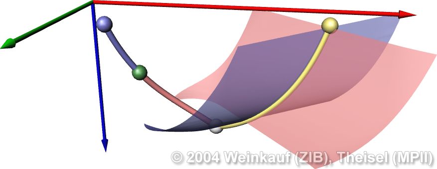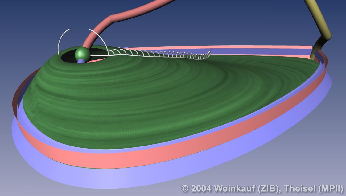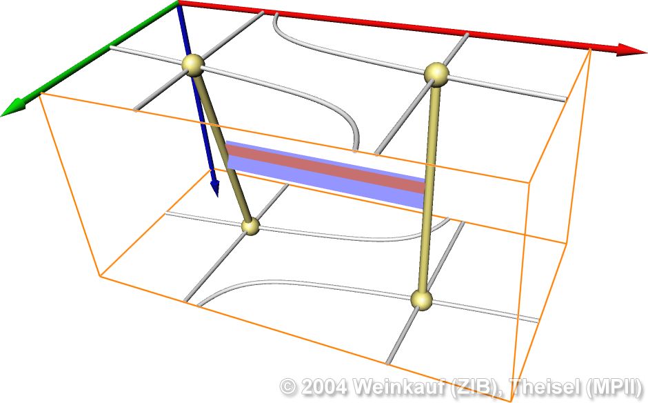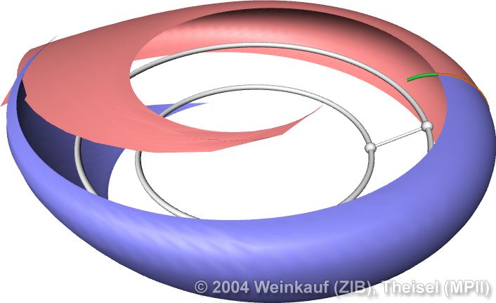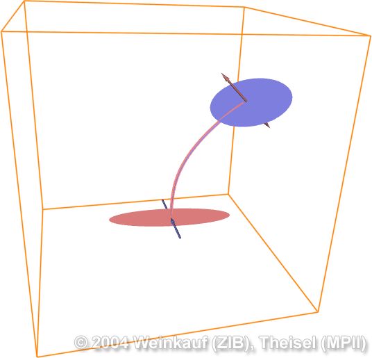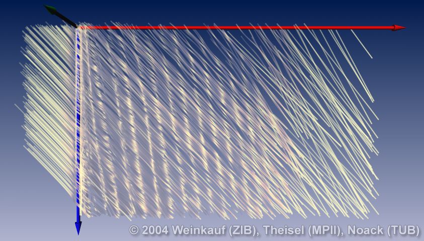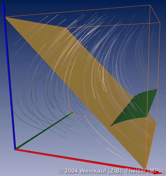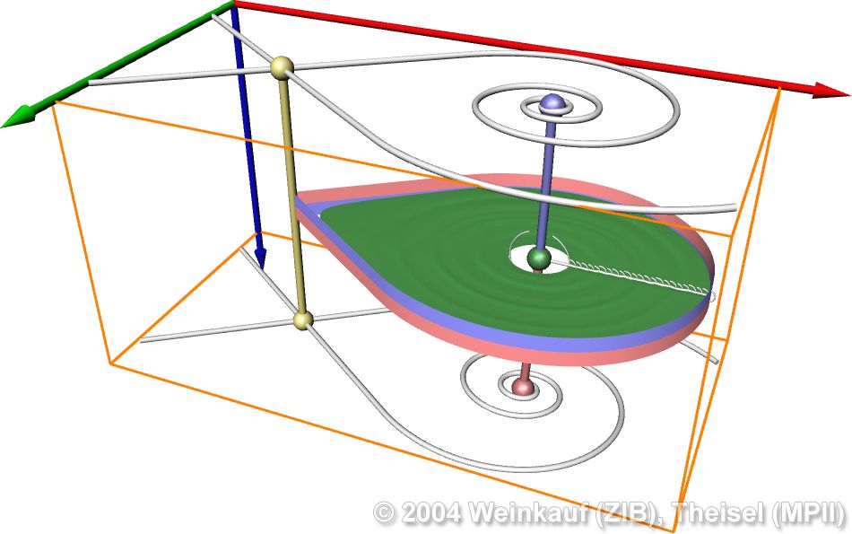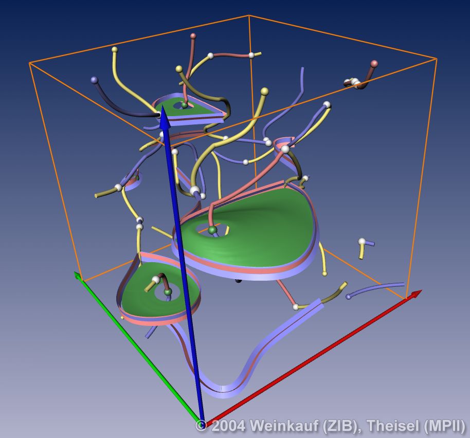 Topological methods aim at the segmentation of a vector field into areas of different flow behavior. For 2D time-dependent vector fields, two such segmentations are possible: either concerning the behavior of stream lines, or of path lines. While stream line oriented topology is well established, we introduce path line oriented topology as a new visualization approach in this paper. As a contribution to stream line oriented topology we introduce new methods to detect global bifurcations like saddle connections and cyclic fold bifurcations. To get the path line oriented topology we segment the vector field into areas of attracting, repelling and saddle-like behavior of the path lines. We compare both kinds of topologies and apply them to a number of data sets. | Stream Line and Path Line Oriented Topology for 2D Time-Dependent Vector Fields Proc. IEEE Visualization 2004, Austin, U.S.A., October 10 - 15, 2004 |