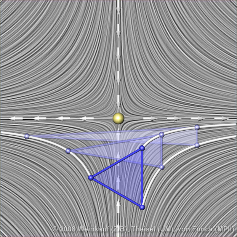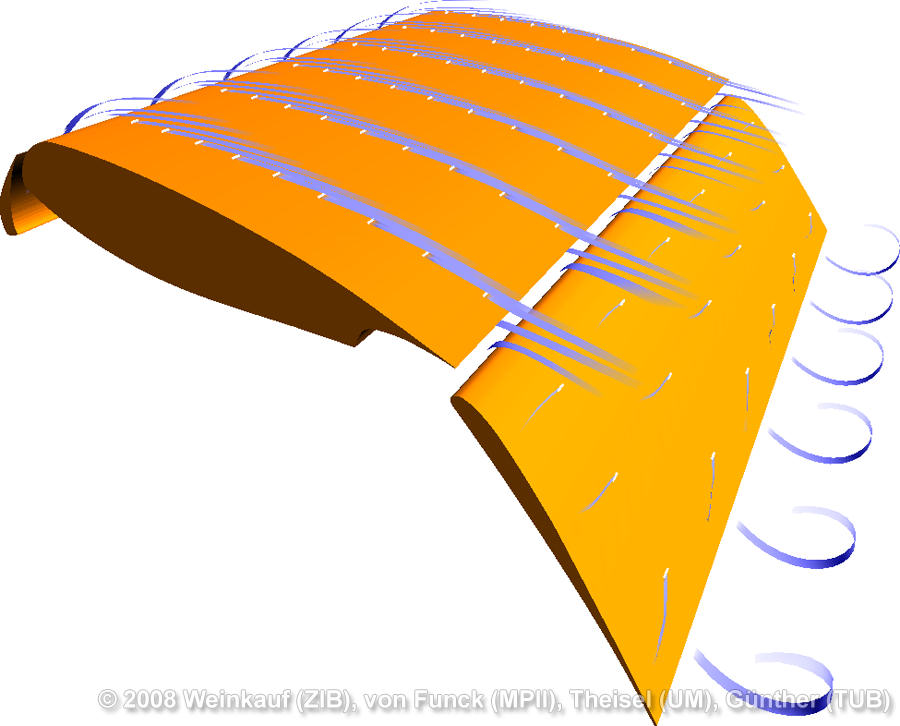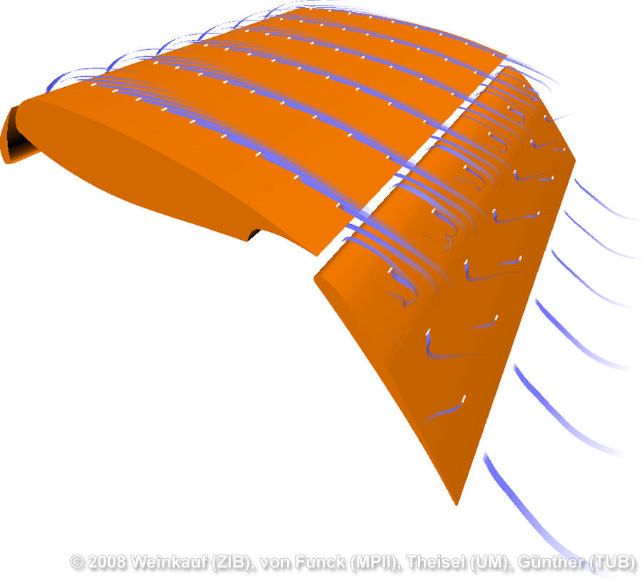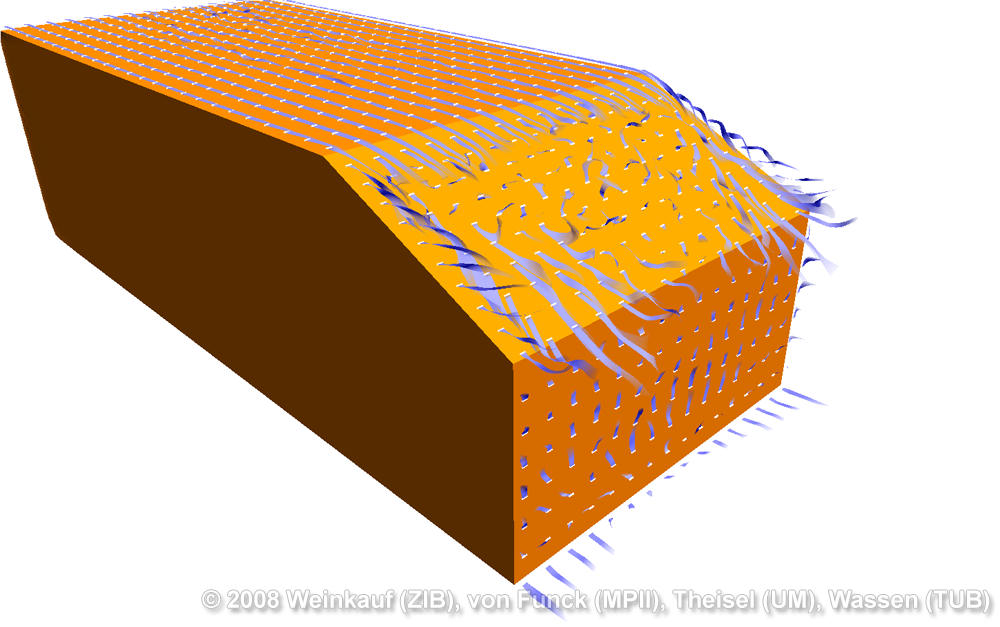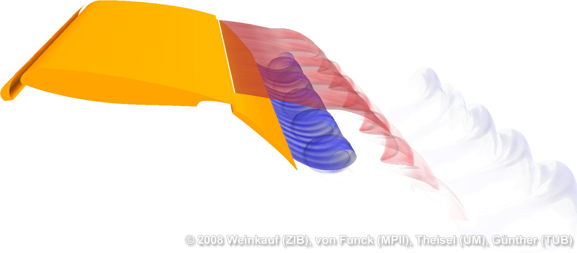 Smoke rendering is a standard technique for flow visualization. Most approaches are based on a volumetric, particle based, or image based representation of the smoke. This paper introduces an alternative representation of smoke structures: as semi-transparent streak surfaces. In order to make streak surface integration fast enough for interactive applications, we avoid expensive adaptive retriangulations by coupling the opacity of the triangles to their shapes. This way, the surface shows a smoke-like look even in rather turbulent areas. Furthermore, we show modifications of the approach to mimic smoke nozzles, wool tufts, and time surfaces. The technique is applied to a number of test data sets. | Smoke Surfaces: An Interactive Flow Visualization Technique Inspired by Real-World Flow Experiments IEEE Transactions on Visualization and Computer Graphics (Proceedings Visualization 2008) 14(6), November - December 2008 |