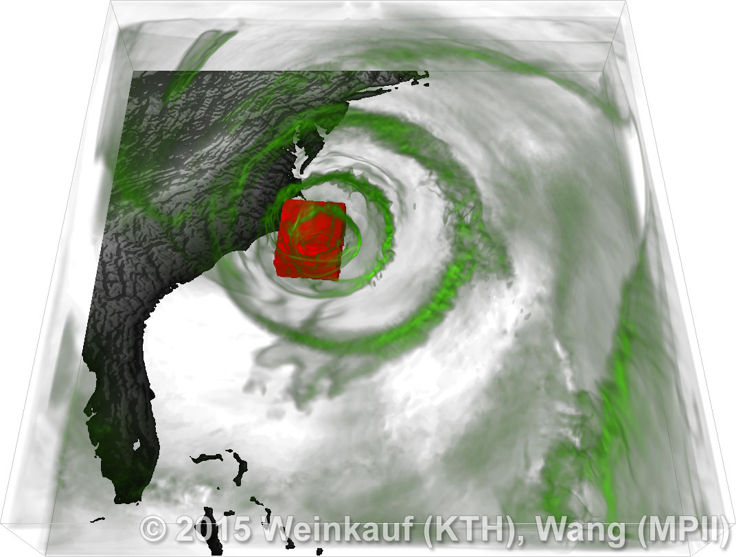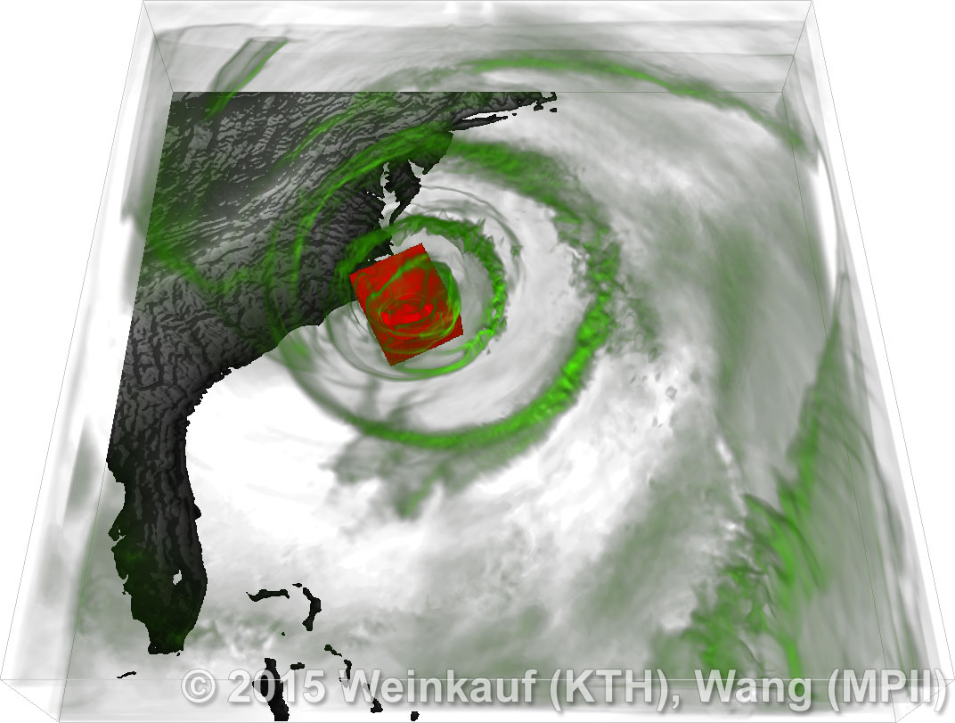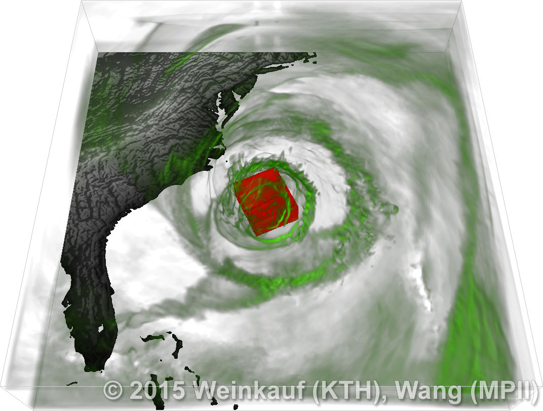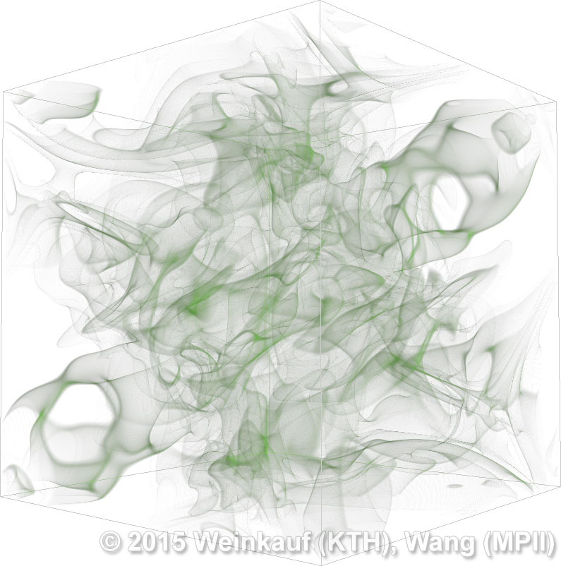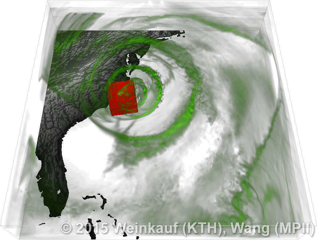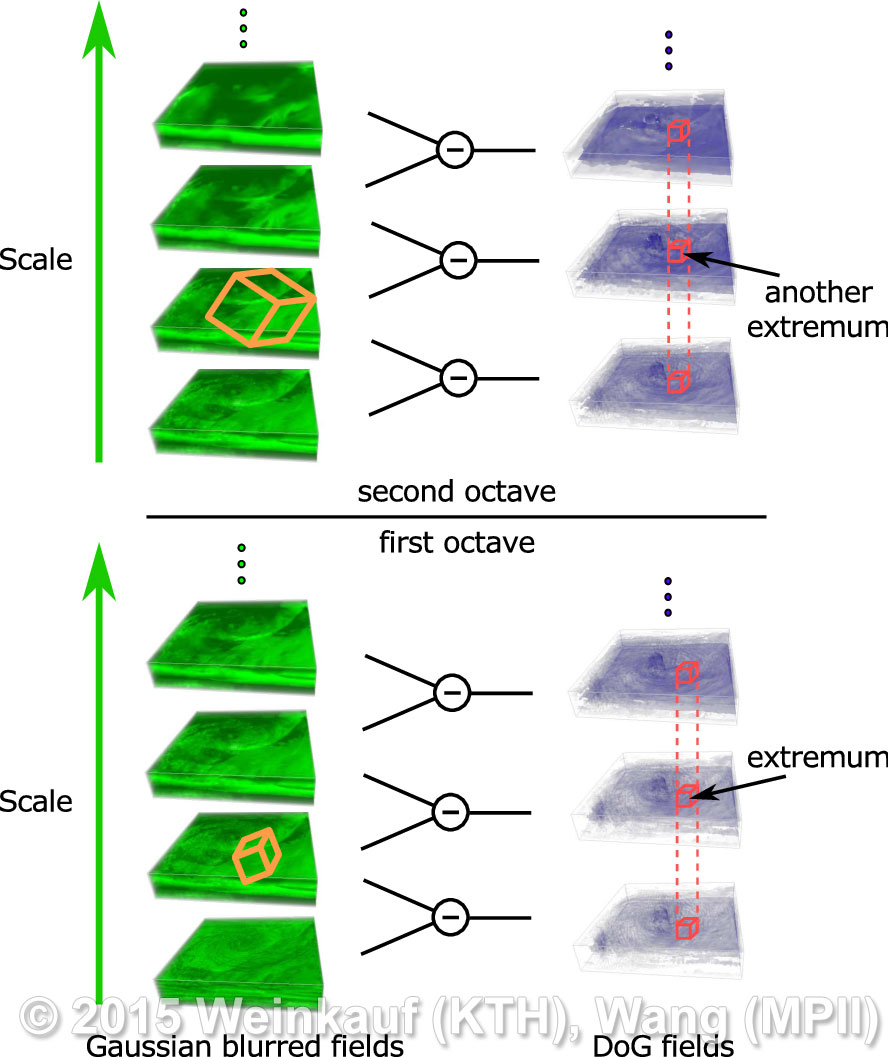 We present an approach to pattern matching in 3D multi-field scalar data. Existing pattern matching algorithms work on single scalar or vector fields only, yet many numerical simulations output multi-field data where only a joint analysis of multiple fields describes the underlying phenomenon fully. Our method takes this into account by bundling information from multiple fields into the description of a pattern. First, we extract a sparse set of features for each 3D scalar field using the 3D SIFT algorithm (Scale-Invariant Feature Transform). This allows for a memory-saving description of prominent features in the data with invariance to translation, rotation, and scaling. Second, the user defines a pattern as a set of SIFT features in multiple fields by e.g. brushing a region of interest. Third, we locate and rank matching patterns in the entire data set. Experiments show that our algorithm is efficient in terms of required memory and computational efforts. | Multi-field Pattern Matching based on Sparse Feature Sampling IEEE Transactions on Visualization and Computer Graphics (Proc. IEEE VIS) 22(1), January 2016 |