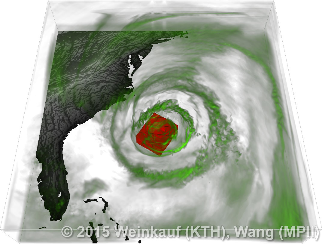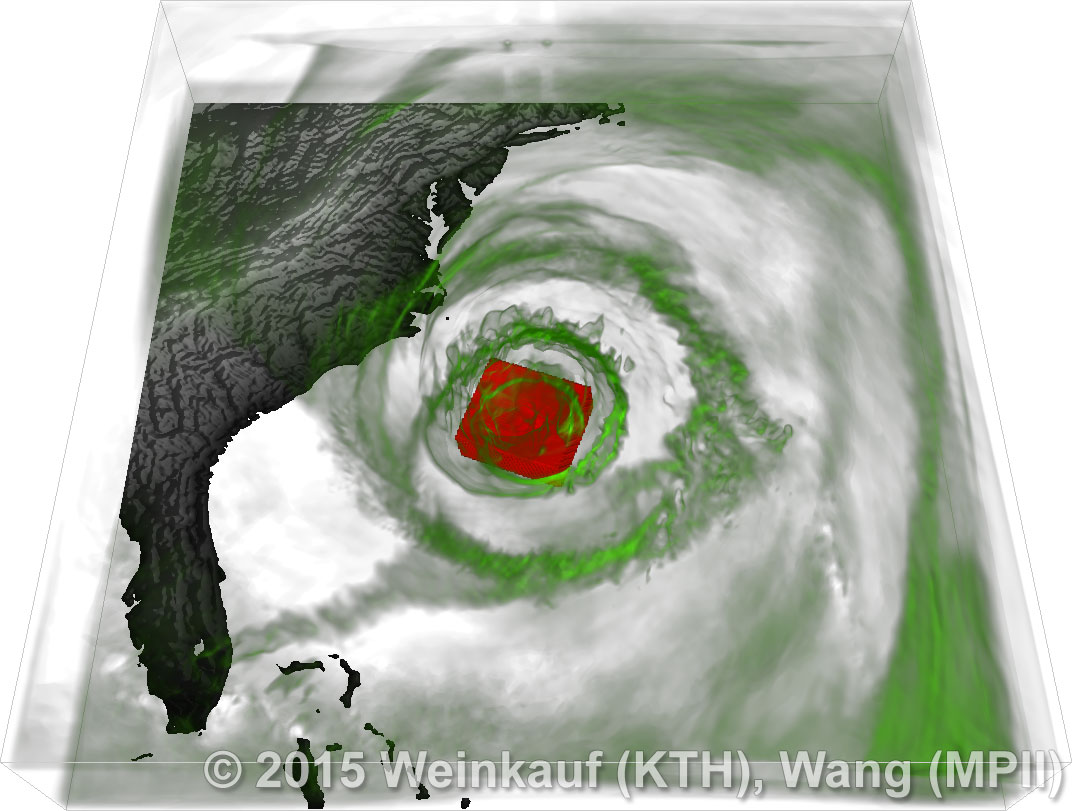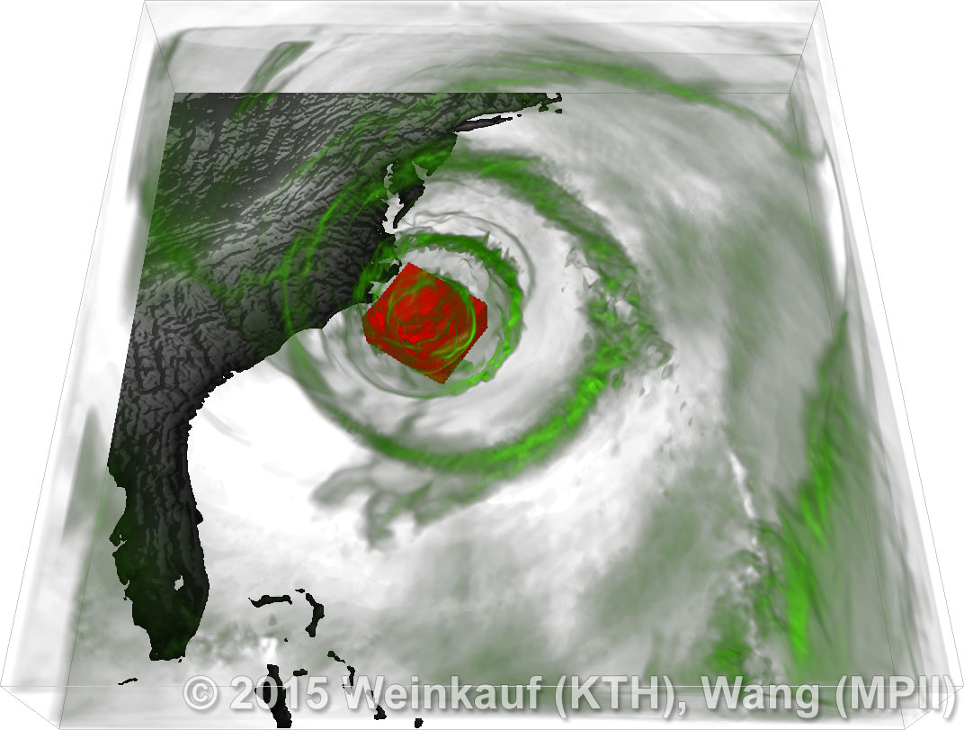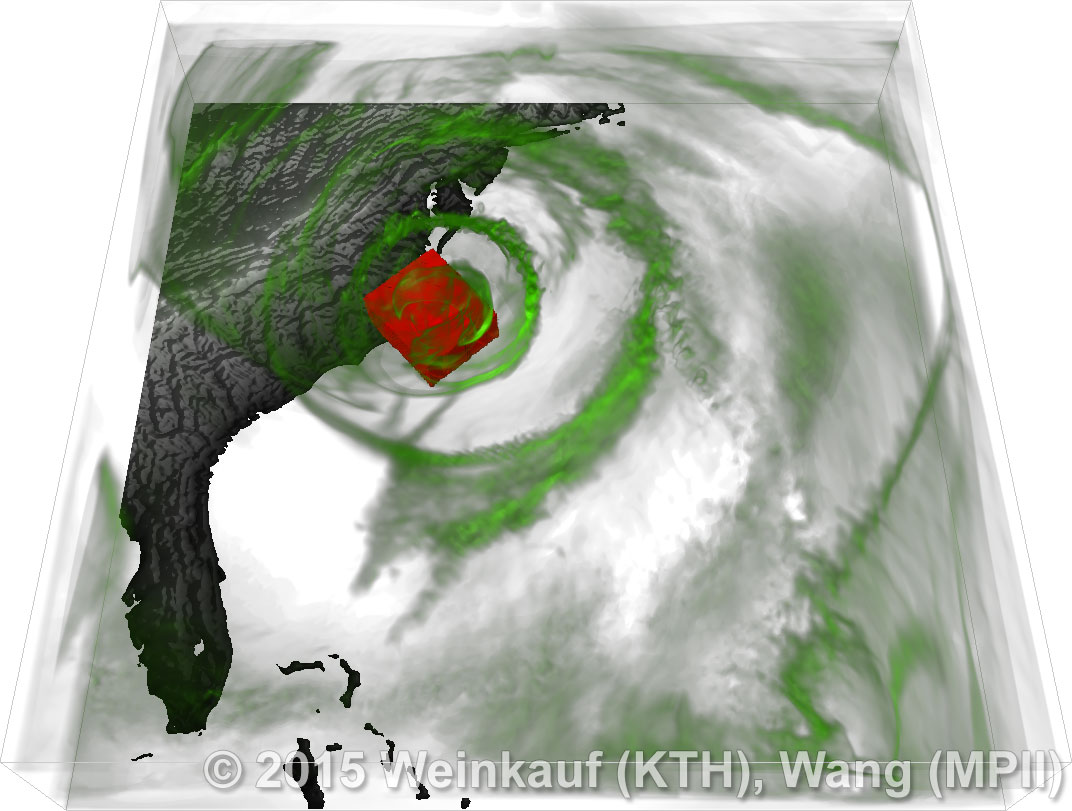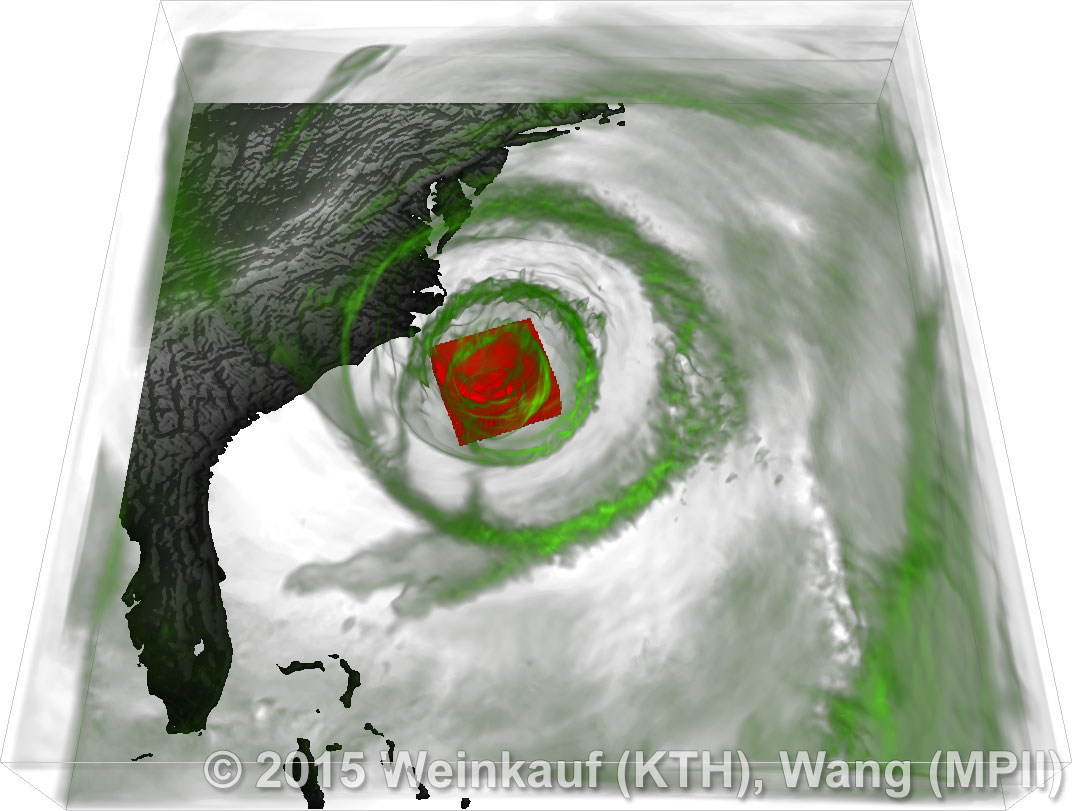 We present an approach to pattern matching in 3D multi-field scalar data. Existing pattern matching algorithms work on single scalar or vector fields only, yet many numerical simulations output multi-field data where only a joint analysis of multiple fields describes the underlying phenomenon fully. Our method takes this into account by bundling information from multiple fields into the description of a pattern. First, we extract a sparse set of features for each 3D scalar field using the 3D SIFT algorithm (Scale-Invariant Feature Transform). This allows for a memory-saving description of prominent features in the data with invariance to translation, rotation, and scaling. Second, the user defines a pattern as a set of SIFT features in multiple fields by e.g. brushing a region of interest. Third, we locate and rank matching patterns in the entire data set. Experiments show that our algorithm is efficient in terms of required memory and computational efforts. | Multi-field Pattern Matching based on Sparse Feature Sampling IEEE Transactions on Visualization and Computer Graphics (Proc. IEEE VIS) 22(1), January 2016 |