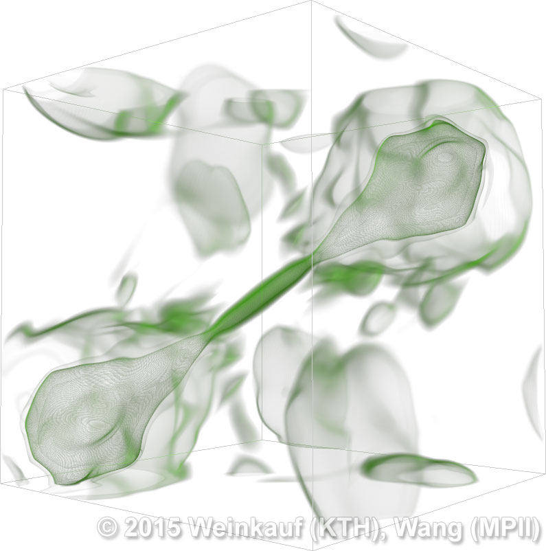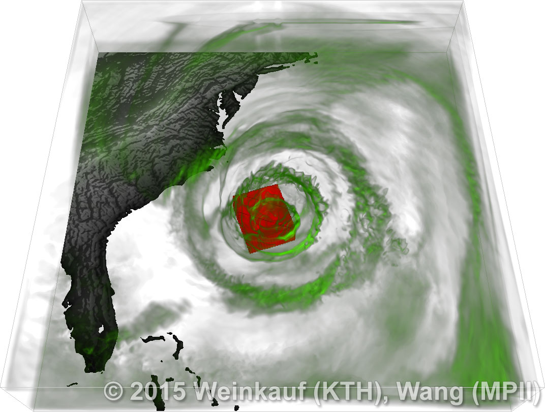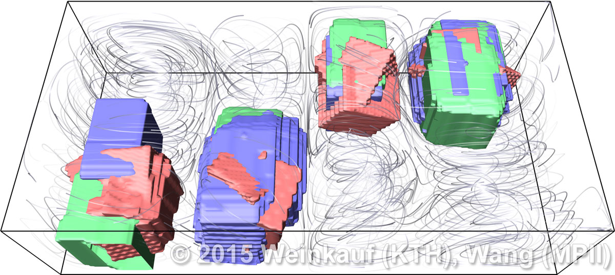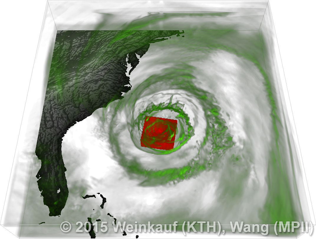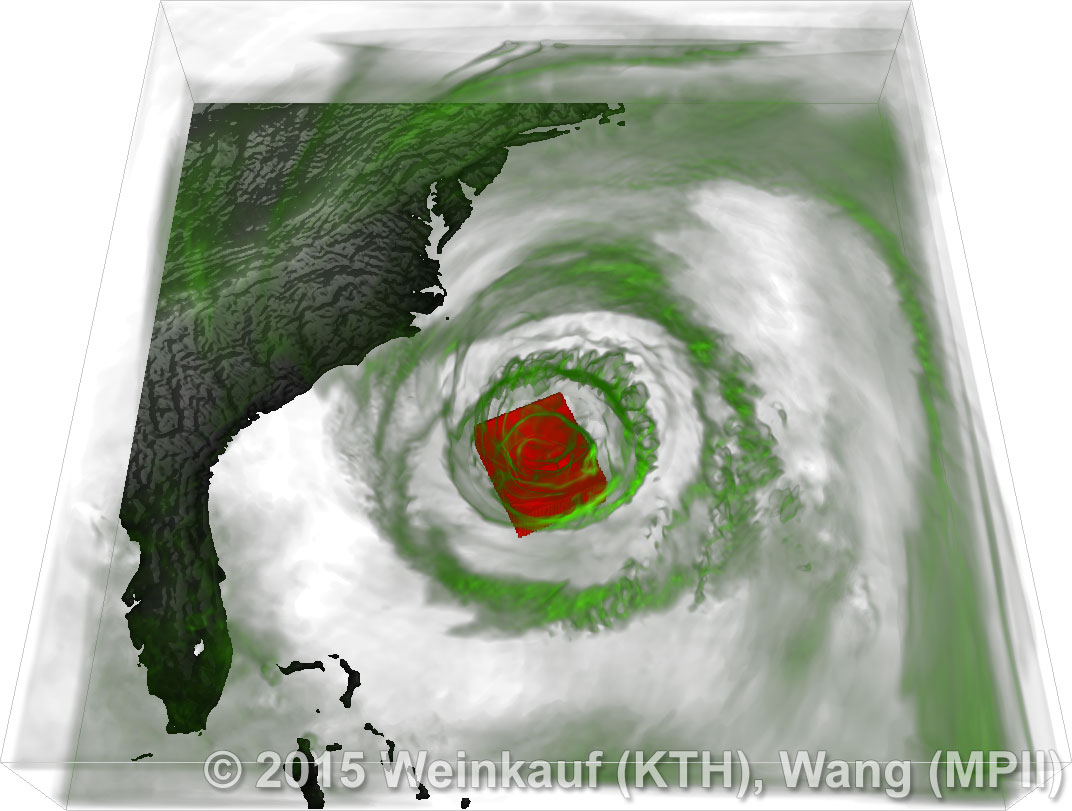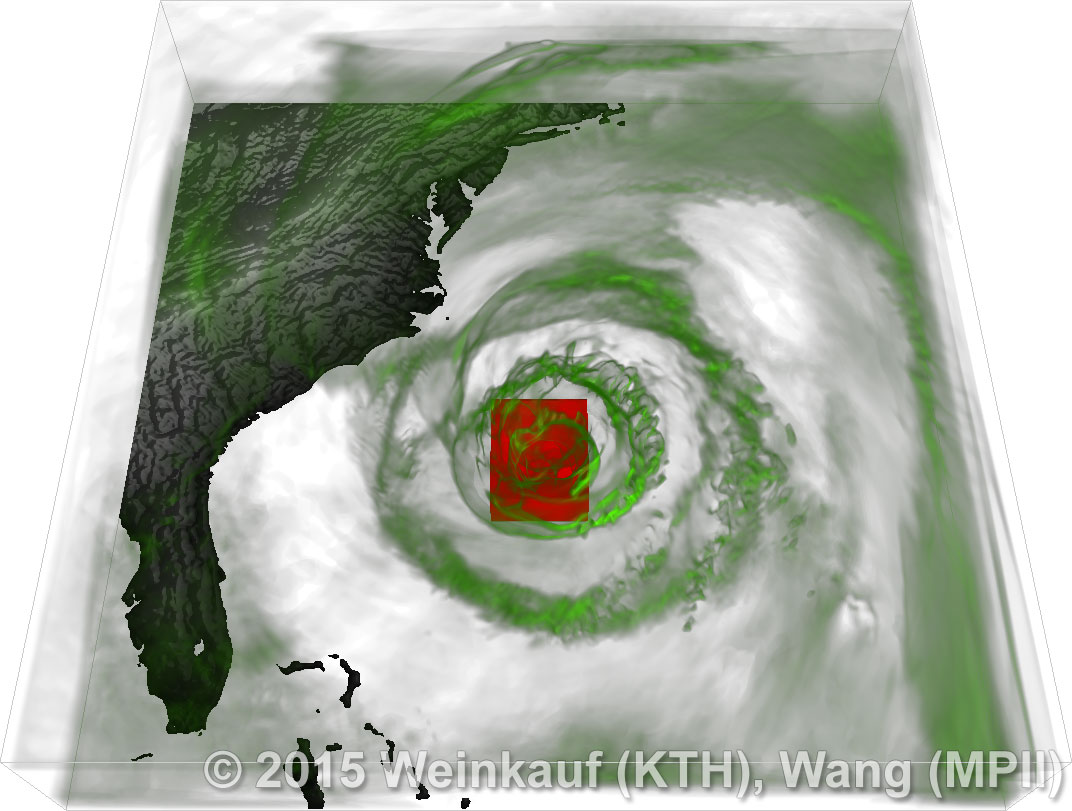 We present an approach to pattern matching in 3D multi-field scalar data. Existing pattern matching algorithms work on single scalar or vector fields only, yet many numerical simulations output multi-field data where only a joint analysis of multiple fields describes the underlying phenomenon fully. Our method takes this into account by bundling information from multiple fields into the description of a pattern. First, we extract a sparse set of features for each 3D scalar field using the 3D SIFT algorithm (Scale-Invariant Feature Transform). This allows for a memory-saving description of prominent features in the data with invariance to translation, rotation, and scaling. Second, the user defines a pattern as a set of SIFT features in multiple fields by e.g. brushing a region of interest. Third, we locate and rank matching patterns in the entire data set. Experiments show that our algorithm is efficient in terms of required memory and computational efforts. | Multi-field Pattern Matching based on Sparse Feature Sampling IEEE Transactions on Visualization and Computer Graphics (Proc. IEEE VIS) 22(1), January 2016 |