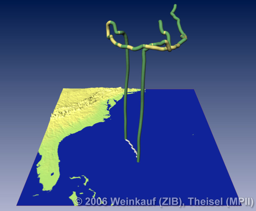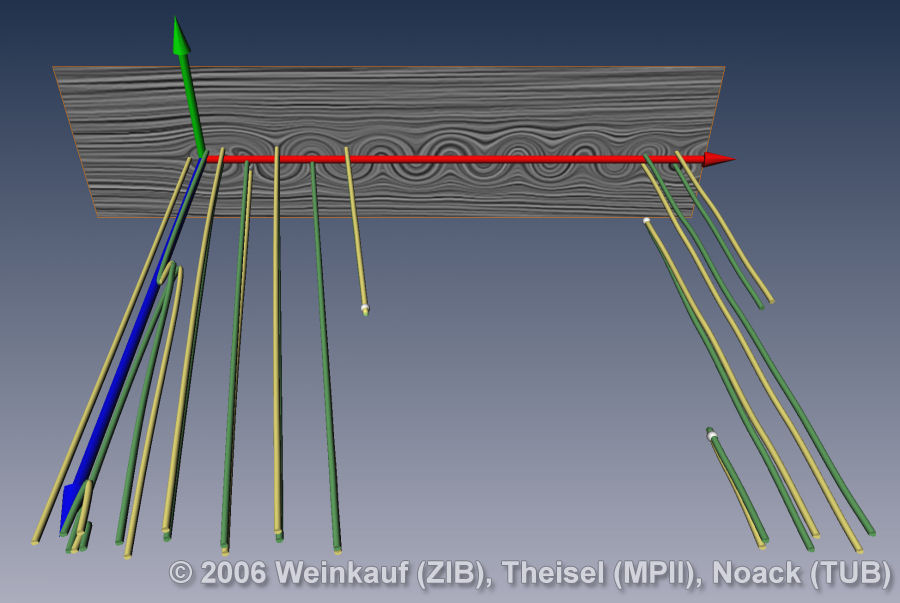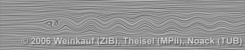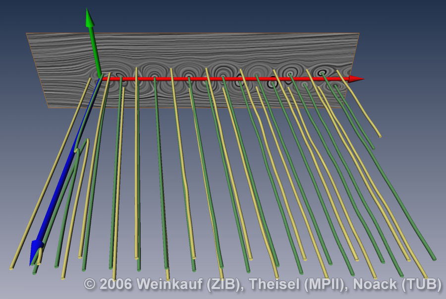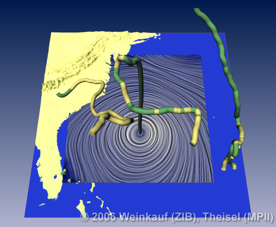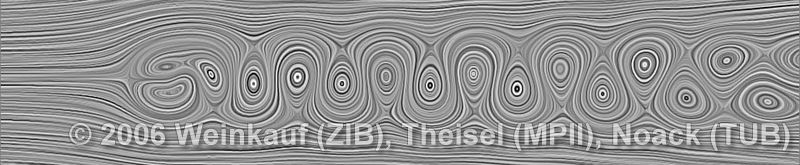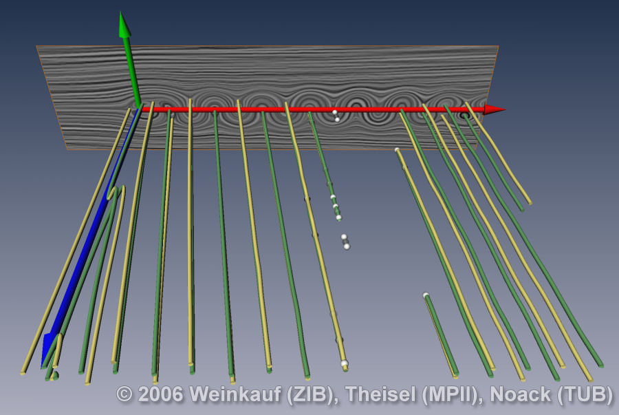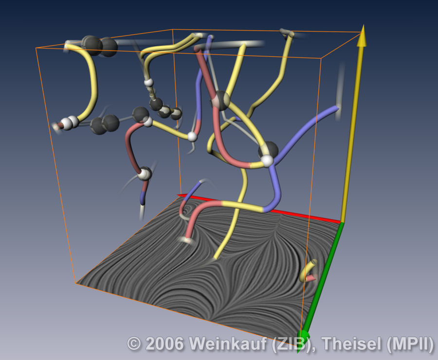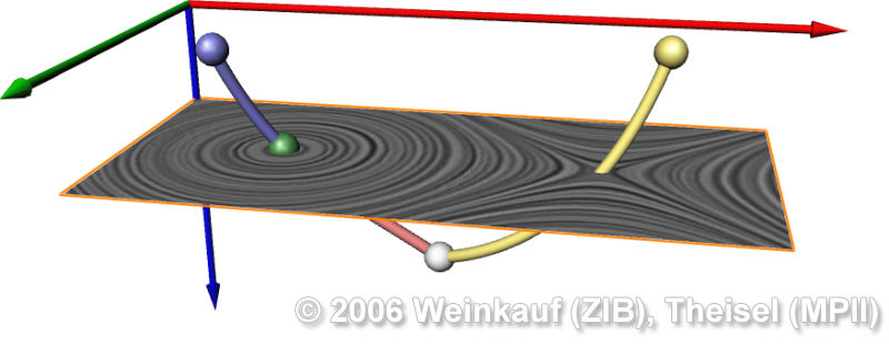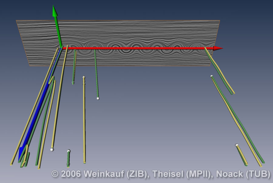 In this paper we extract and visualize the topological skeleton of two-parameter-dependent vector fields. This kind of vector data depends on two parameter dimensions, for instance physical time and a scale parameter. We show that two important classes of local bifurcations - fold and Hopf bifurcations - build line structures for which we present an approach to extract them. Furthermore we show that new kinds of structurally stable local bifurcations exist for this data, namely fold-fold and Hopf-fold bifurcations. We present a complete classification of them. We apply our topological extraction method to analyze a number of two-parameter-dependent vector fields with different physical interpretations of the two additional dimensions. | Topological Structures in Two-Parameter-Dependent 2D Vector Fields Computer Graphics Forum (Proc. Eurographics) 25(3), September 2006 |