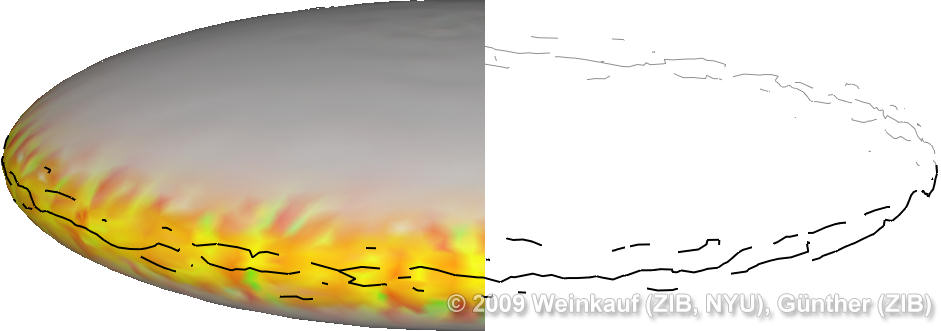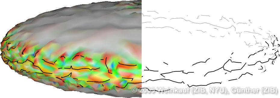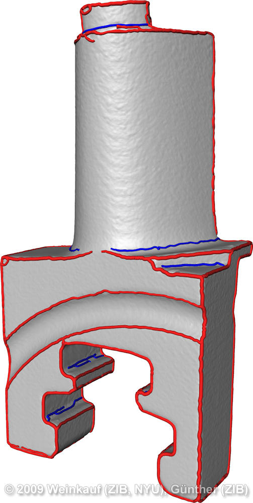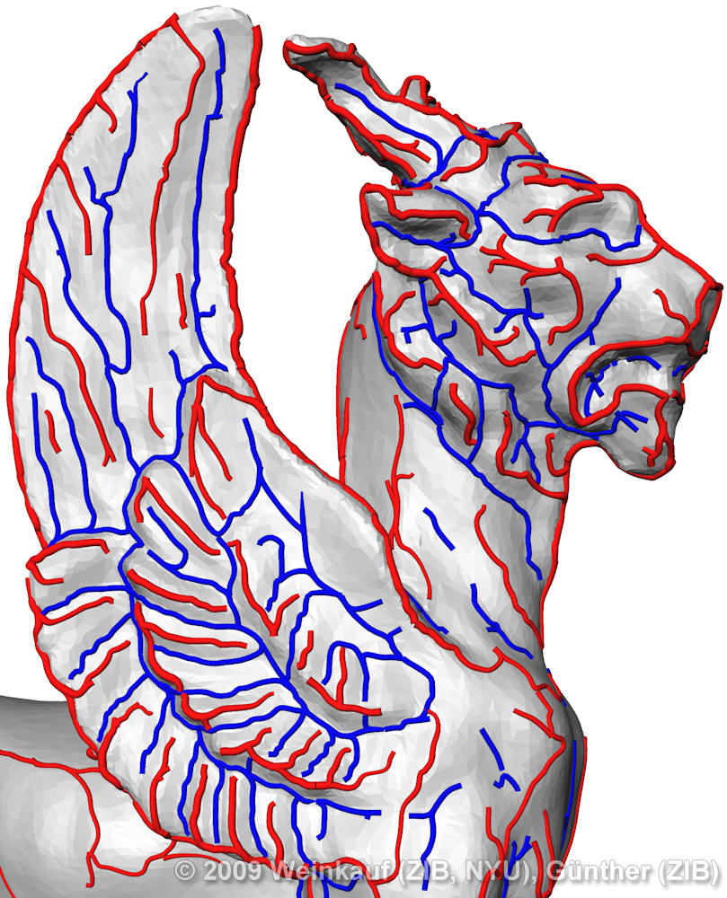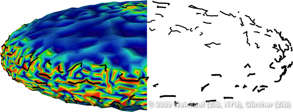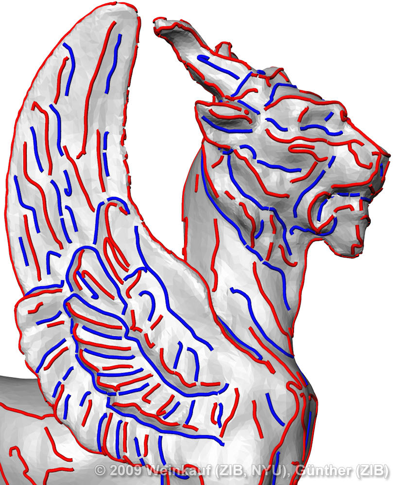 Salient edges are perceptually prominent features of a surface. Most previous extraction schemes utilize the notion of ridges and valleys for their detection, thereby requiring curvature derivatives which are rather sensitive to noise. We introduce a novel method for salient edge extraction which does not depend on curvature derivatives. It is based on a topological analysis of the principal curvatures and salient edges of the surface are identified as parts of separatrices of the topological skeleton. Previous topological approaches obtain results including non-salient edges due to inherent properties of the underlying algorithms. We extend the profound theory by introducing the novel concept of separatrix persistence, which is a smooth measure along a separatrix and allows to keep its most salient parts only. We compare our results with other methods for salient edge extraction. | Separatrix Persistence: Extraction of Salient Edges on Surfaces Using Topological Methods Computer Graphics Forum (Proc. SGP '09) 28(5), July 2009 |