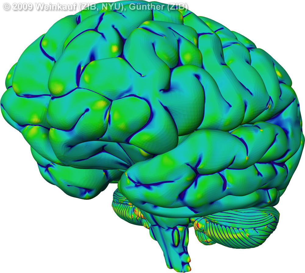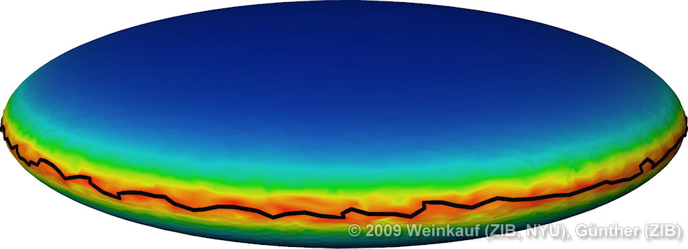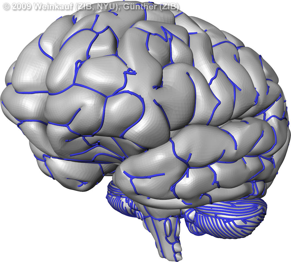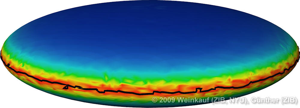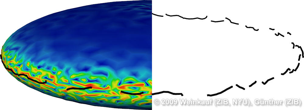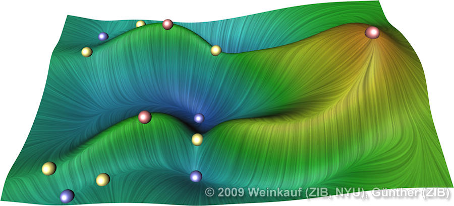 Salient edges are perceptually prominent features of a surface. Most previous extraction schemes utilize the notion of ridges and valleys for their detection, thereby requiring curvature derivatives which are rather sensitive to noise. We introduce a novel method for salient edge extraction which does not depend on curvature derivatives. It is based on a topological analysis of the principal curvatures and salient edges of the surface are identified as parts of separatrices of the topological skeleton. Previous topological approaches obtain results including non-salient edges due to inherent properties of the underlying algorithms. We extend the profound theory by introducing the novel concept of separatrix persistence, which is a smooth measure along a separatrix and allows to keep its most salient parts only. We compare our results with other methods for salient edge extraction. | Separatrix Persistence: Extraction of Salient Edges on Surfaces Using Topological Methods Computer Graphics Forum (Proc. SGP '09) 28(5), July 2009 |
